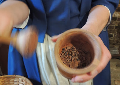 We were given intensely strong tastes of this hot cocoa as cocoa was used primarily as a beverage. (No milk was added. That only came about in the late 1800s. Chocolate bars with milk were invented in about 1870s.)